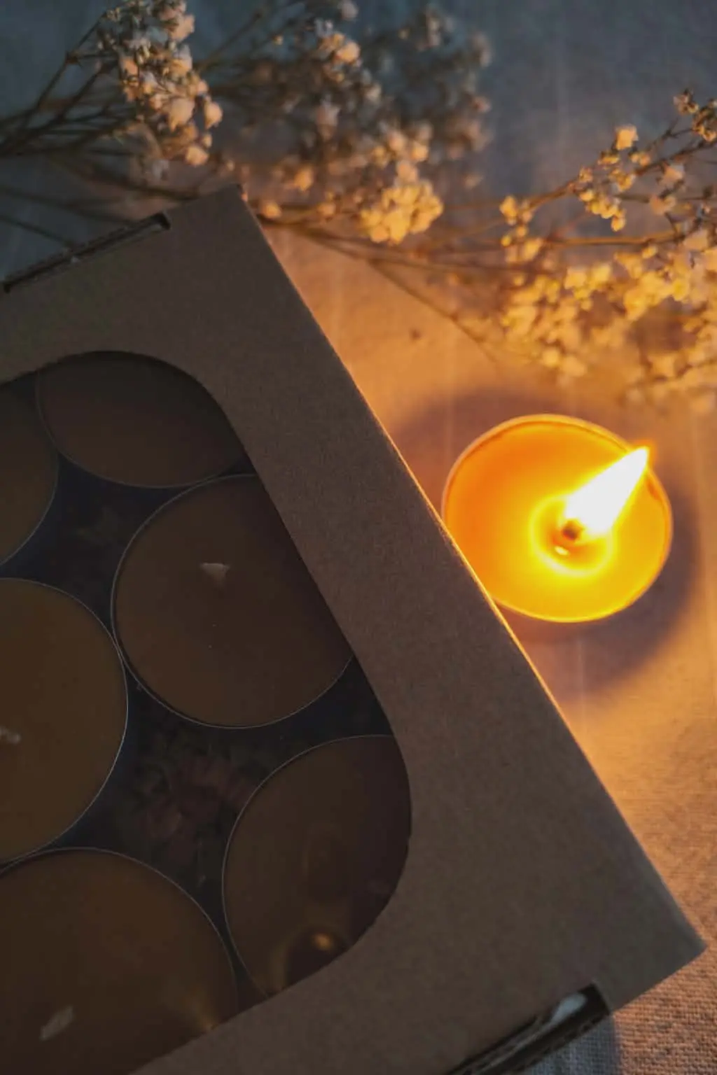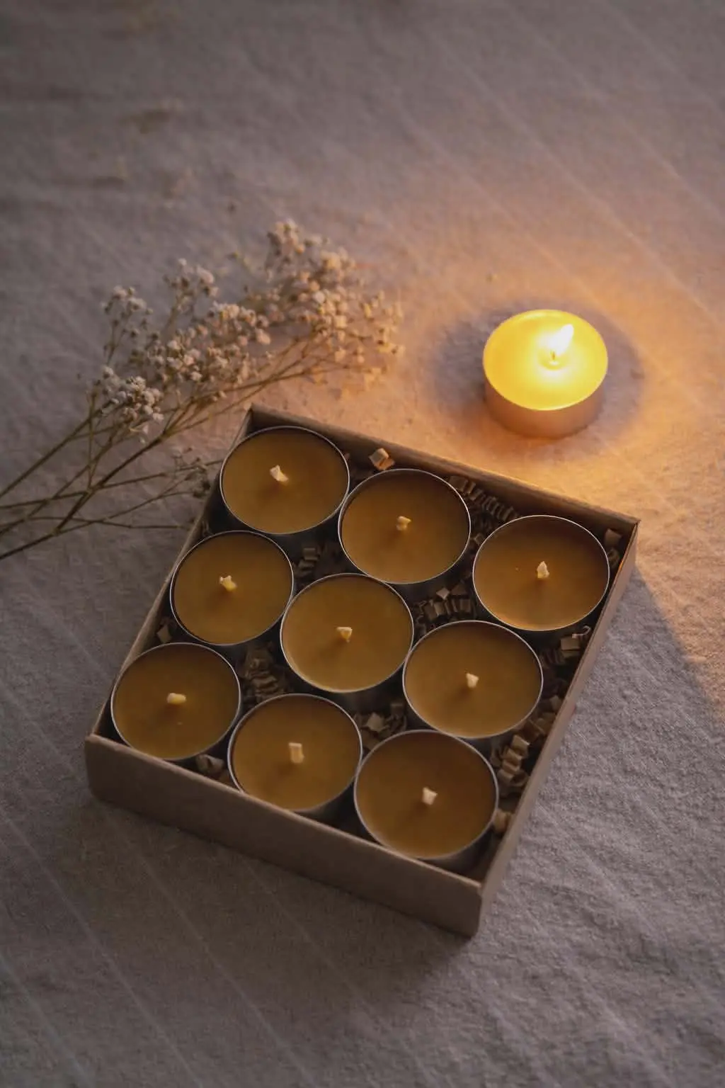 Zestaw zapakowany jest w minimalistyczne, szare pudełko z okienkiem, które podkreśla naturalny charakter świec i pozwala od razu zobaczyć ich ciepłą barwę. To nie jest produkt masowy. To małe światło, które wybiera się świadomie.